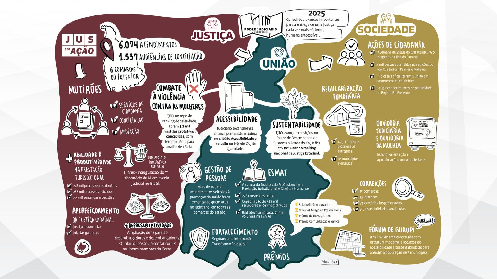 Pela primeira vez, o Poder Judiciário Tocantinense publica uma versão impressa, em linguagem simples, do relatório de atividades. Apresentada na abertura do Ano Judiciário, nessa segunda-feira (2/2), a ilustração traz as principais ações realizadas em 2025 pelo Tribunal de Justiça do Estado do Tocantins (TJTO), pela Corregedoria-Geral da Justiça (CGJUS), pela Ouvidoria Judiciária, pela Ouvidoria da Mulher e pela Escola Superior da Magistratura Tocantinense (Esmat).